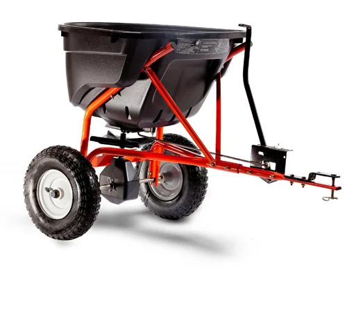 Agri-Fab tow behind smart spreader suitable for fertilisers or salt. Hopper capacity 130lb. Broadcast spread wide  Unique spreader setting knob is user friendly for precise application  Spring loaded on/off lever that is inspired by commercial spreaders