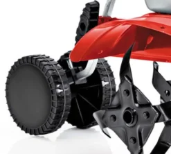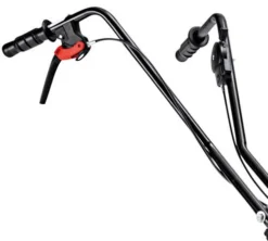 Manoeuvre this machine easily between working areas with the rear transport wheels. Includes a safety lever on the handles that prevents turning the blades on accidentally. Ergonomically designed soft grip handle bars for user comfort.