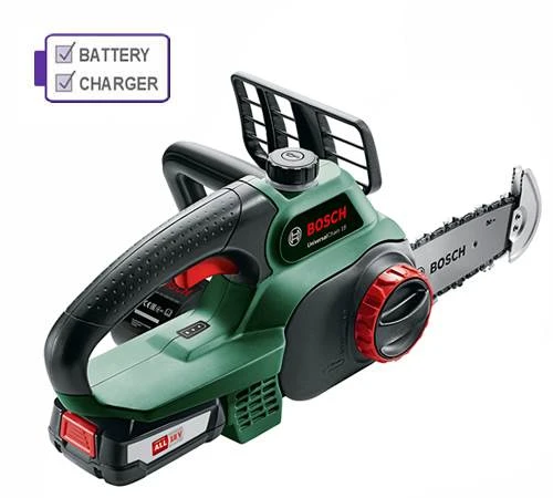 The Bosch compact 20cm. 8”chainsaw is supplied with everything you need to get going. The 18v / 2.5 Ah battery is fully charged and ready to go within 60 minutes and runs for approximately 40 cuts per charge. The battery has a charge indicator to display power levels. The 20cm bar is ideal for pruning small branches and sawing firewood. The chainsaw comes with plenty of quality features such as automatic lubrication and tool-less chain tensoning.