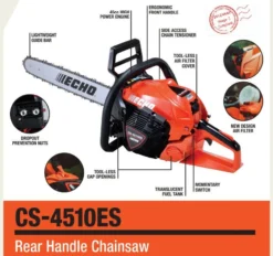 The Echo CS-4510ES is a versatile rear handled chainsaw with a premium grade echo® 45cc engine. Feature packed. well balanced. lightweight and user friendly. this chainsaw is ideal for commercial use.