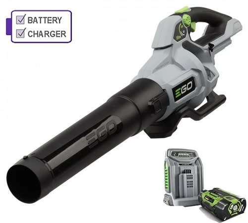 The Ego Power 56V Cordless Leaf Blower Kit LB5804E contains the LB5800E blower. a 5Ah lithium battery. and an Infinity fast charger.