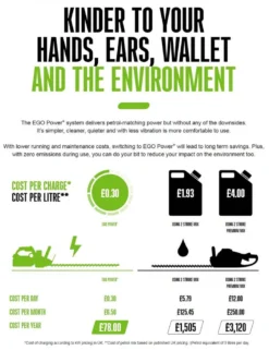 The EGOLB5800E is the most powerful cordless leaf blower on the market using a 56vbattery to produce an air speed of 270 km/h. It has been developed with jetturbine technology and features variable speed and large diameter tube. The outputis more than most hand held petrol blowers produce.