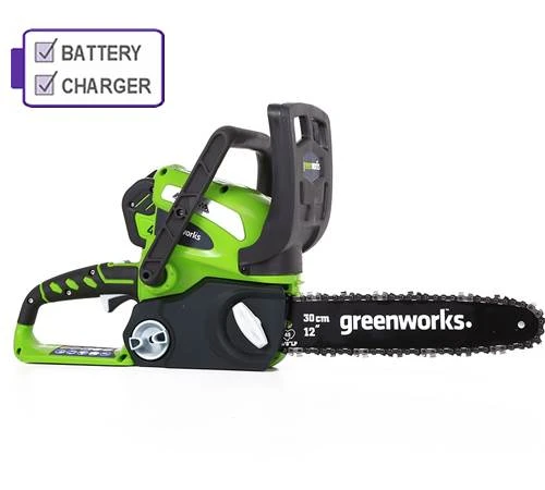 Greenworks G40 CS30 cordless chain saw kit includes a 40v 2Ah lithium-ion battery and battery charger.