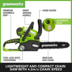 Battery-powered chainsaws are quieter and emit fewer emissions than petrol-powered models. They give the freedom to move around without cables. so all areas of the lawn and garden can be reached. One battery is designed to fit all the 40v gardening tools in the Greenworks range.