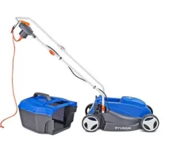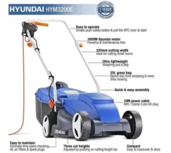 The Hyundai HYM3200E 32cm electric mower is powered by a 1000wmotor and is ideal for small gardens. Benefitting from a 25 litre hard top grasscollector and 10 metre cable.