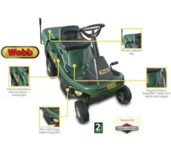 The Webb 12530 Compact Lawn Rider is a practical and incrediblyhard-working ride-on lawn mower. designed with the high-quality features youwould expect from Webb. Just like a manual car. the Webb 12530 has forward andreverse gears. The key start Briggs & Stratton PowerBuilt™ OHV enginepowers the 76cm / 30” single blade cutting deck to produce a superb finish toyour lawn.
